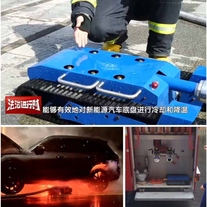 本产品是一款专用于新能源车辆火灾的灭火设备,可以进入到新能源车辆底部,直接对准电池包进行冷却降温,能够有效的将新能源车辆火灾控制在电化学能的释放过程中,避免附属结构燃烧,灭火效率相比传统方式有着非常显著的提高。